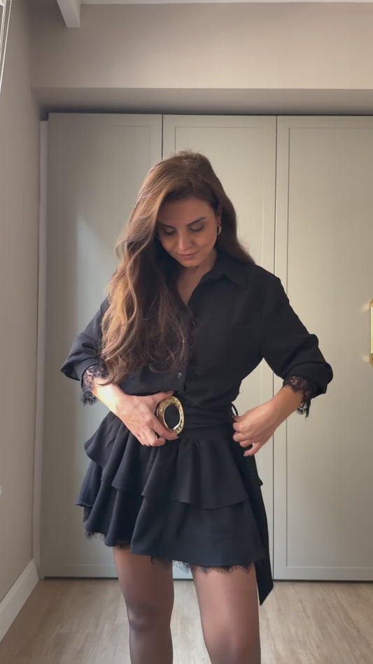 Gold Belted Lace Detail Dress - Black