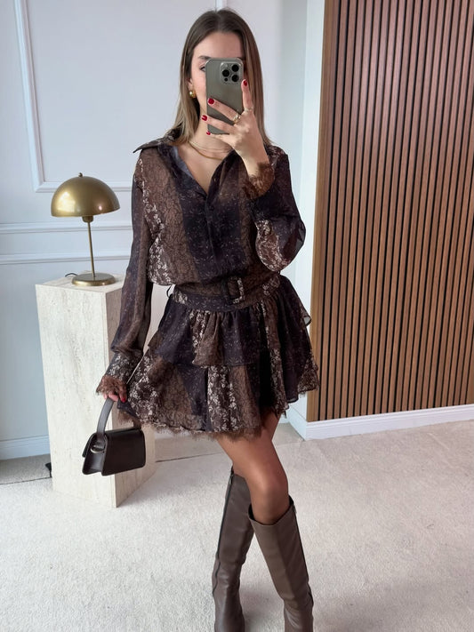 Gold Belted Lace Detail Dress - Brown