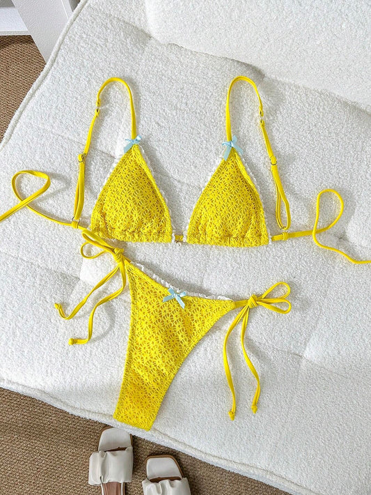 Shein Lace Trim Bow Bikini Set with Pearl Detail