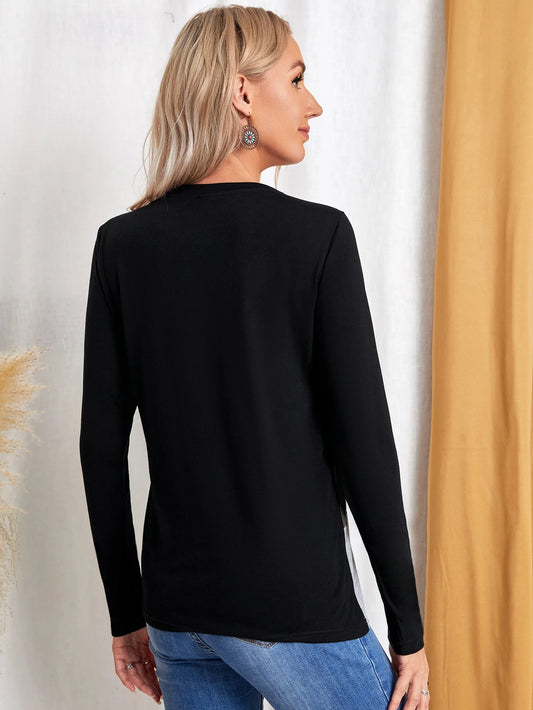 EMERY ROSE – Lace Patchwork V-Neck Knit Sweater