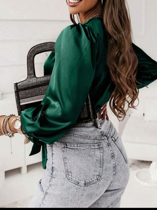 Exquisite Ruched Overlap Satin Top with Elegant Tie Detailing