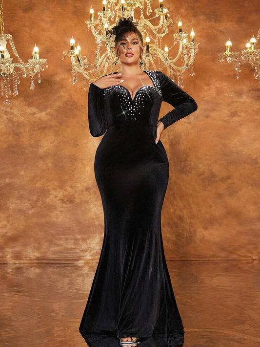 Glamrae Plus Size Pearl & Rhinestone Boat Neck Evening Gown