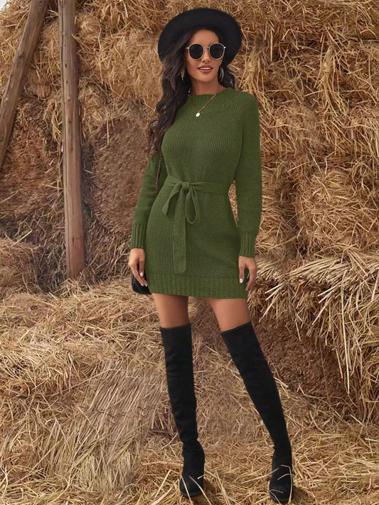 Casual Ribbed Knit Belted Sweater Dress