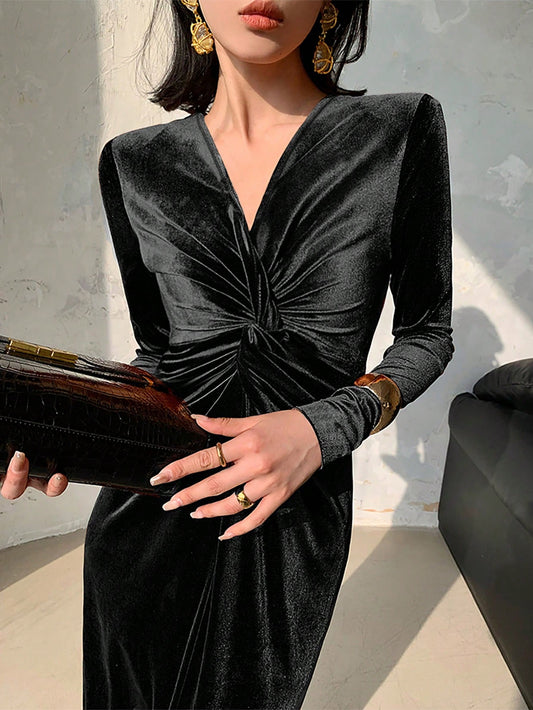 Elegant Solid Color Velvet Twist Detail Bodycon Long Dress