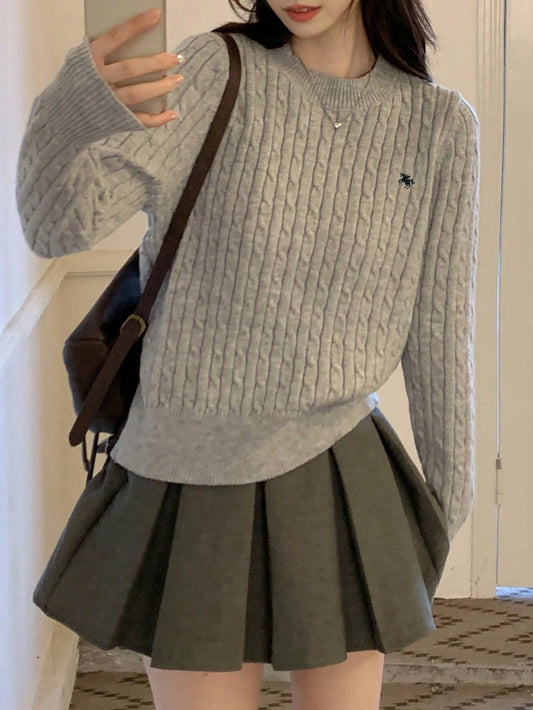 Korean Style – Textured Embroidered Knit Sweater