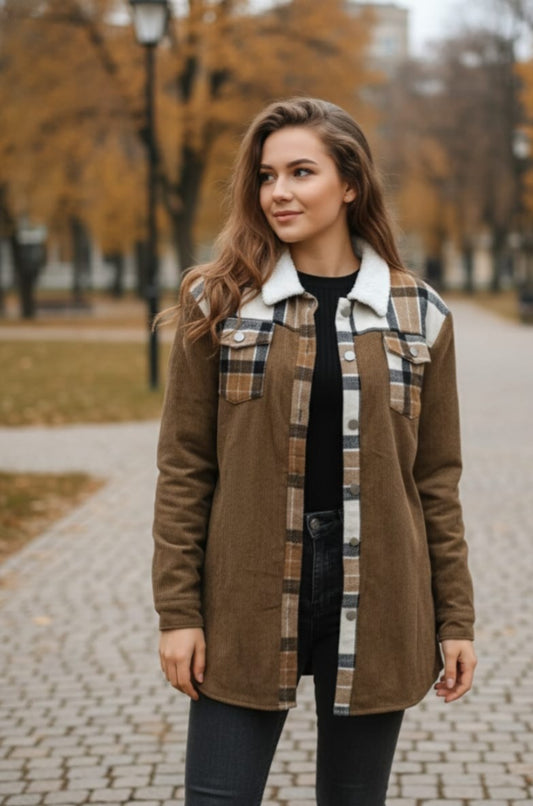 ChicMe Colorblock Plaid Print Corduroy Lined Shacket