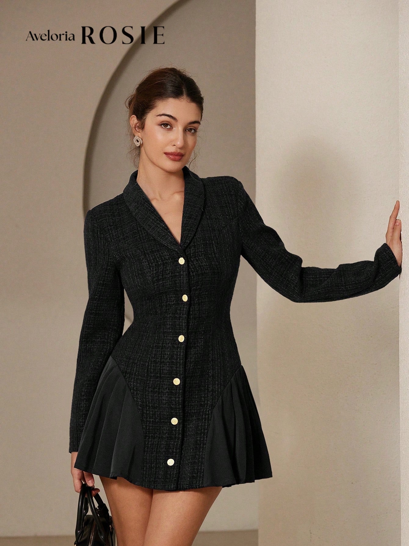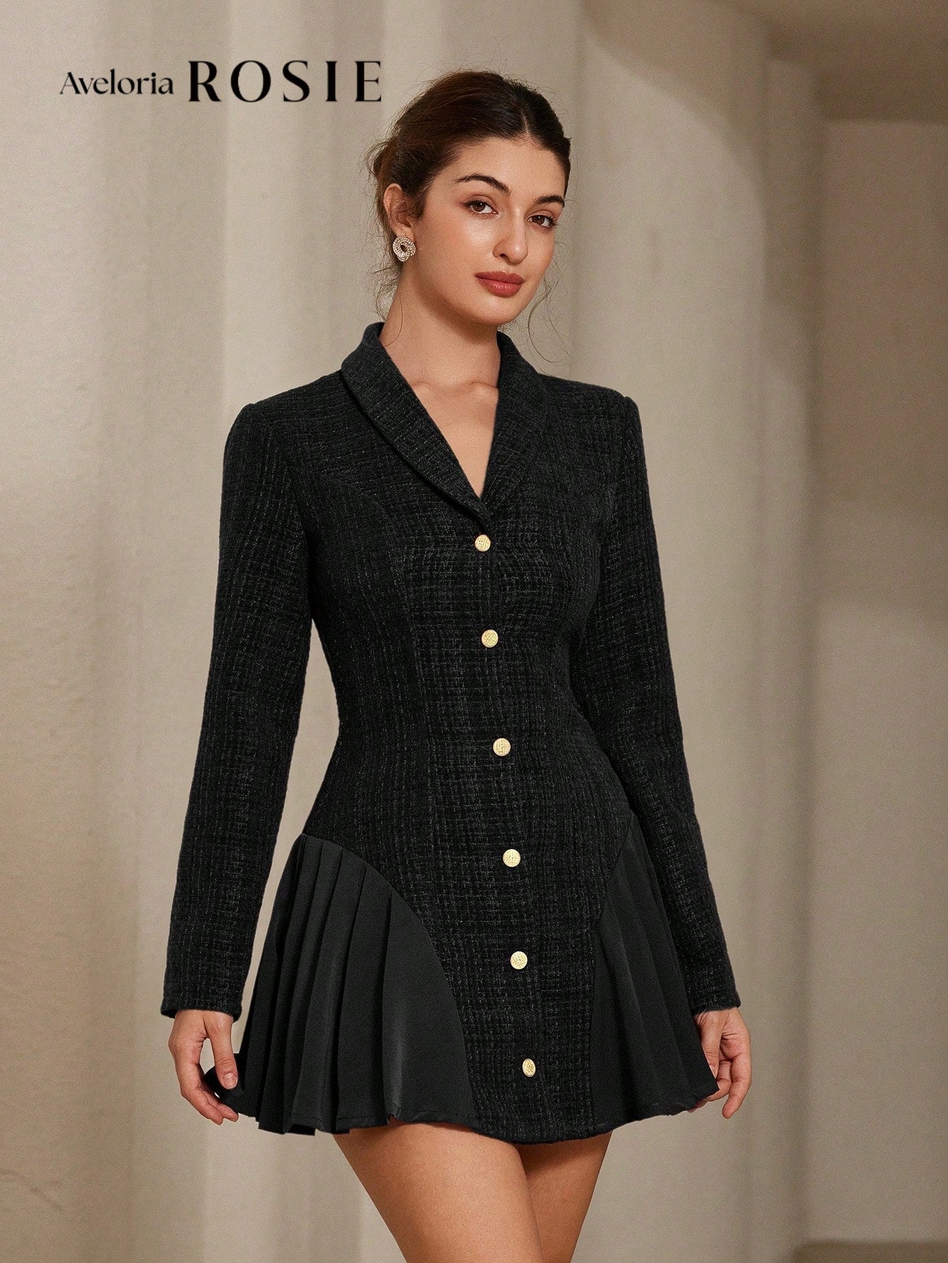 فستان ميني بتصميم Fit & Flare أنيق يجمع بين خامة تويد راقية وتنورة شيفون خفيفة بتباين جذاب. أزرار معدنية تضيف لمسة فخامة واضحة مع قَصّة متوازنة تبرز الخصر. تصميم مثالي للخريف والشتاء يناسب الخروجات والمناسبات الراقية. قطعة مميزة لإطلالة أنثوية فاخرة.