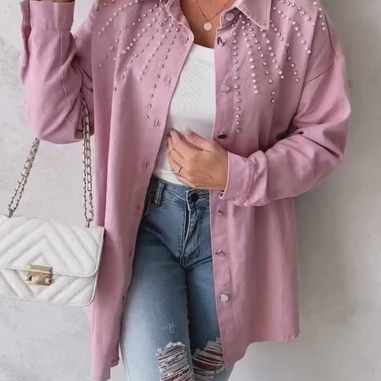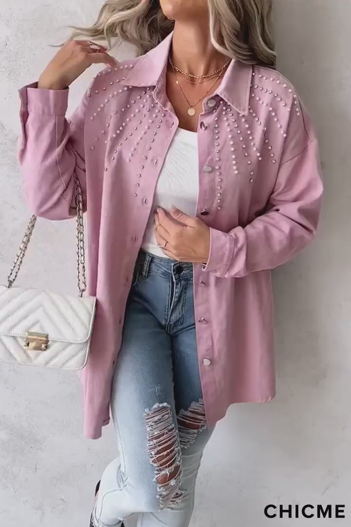 Elegant long pink jacket adorned with pearl details on the chest and shoulders. Made from soft denim-like fabric that feels comfortable and stylish. Perfect for pairing with jeans or casual trousers for a chic everyday look.
