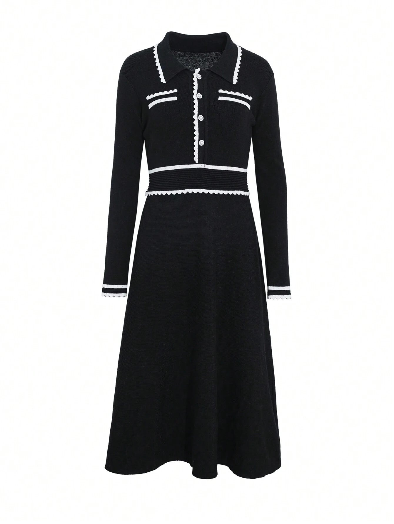An elegant knit sweater dress featuring a colorblock design with a button half-placket.