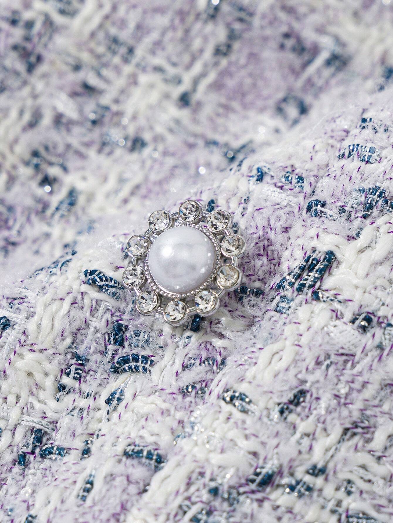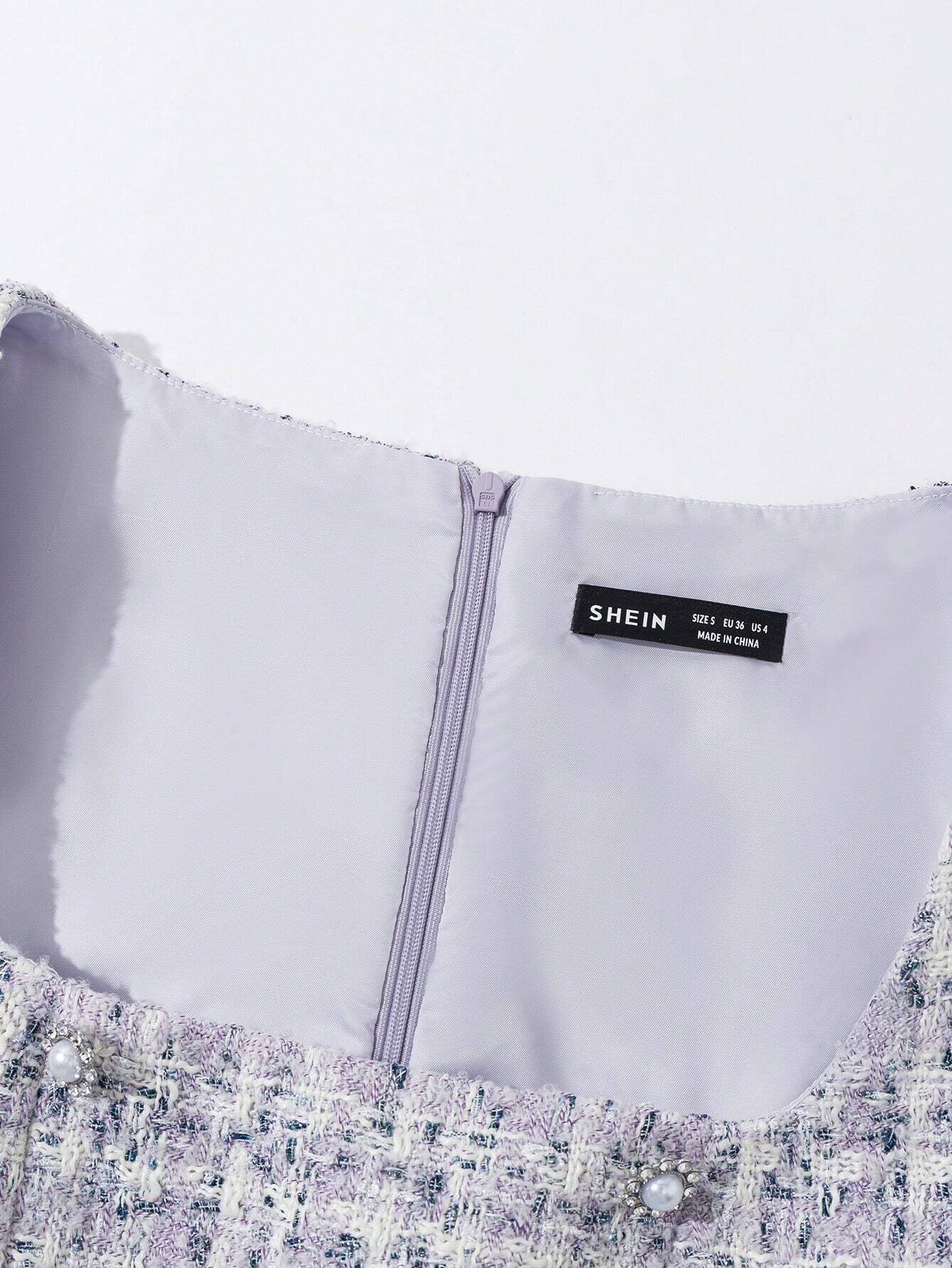 Elegant tweed mini dress with pearl button details.