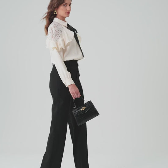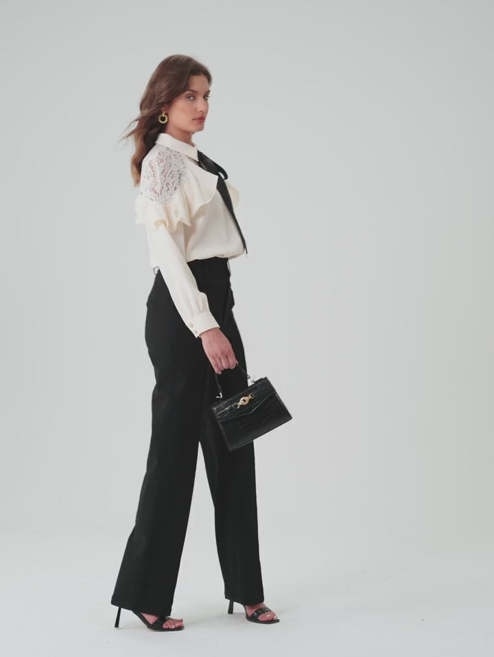 بلوزة أنيقة من MOTF Premium بتصميم فيونكة متباينة على الرقبة مع لمسات من الدانتيل وتفاصيل كشكش راقية. قطعة مثالية لمظهر عملي أنثوي يجمع بين الاحترافية والجاذبية.