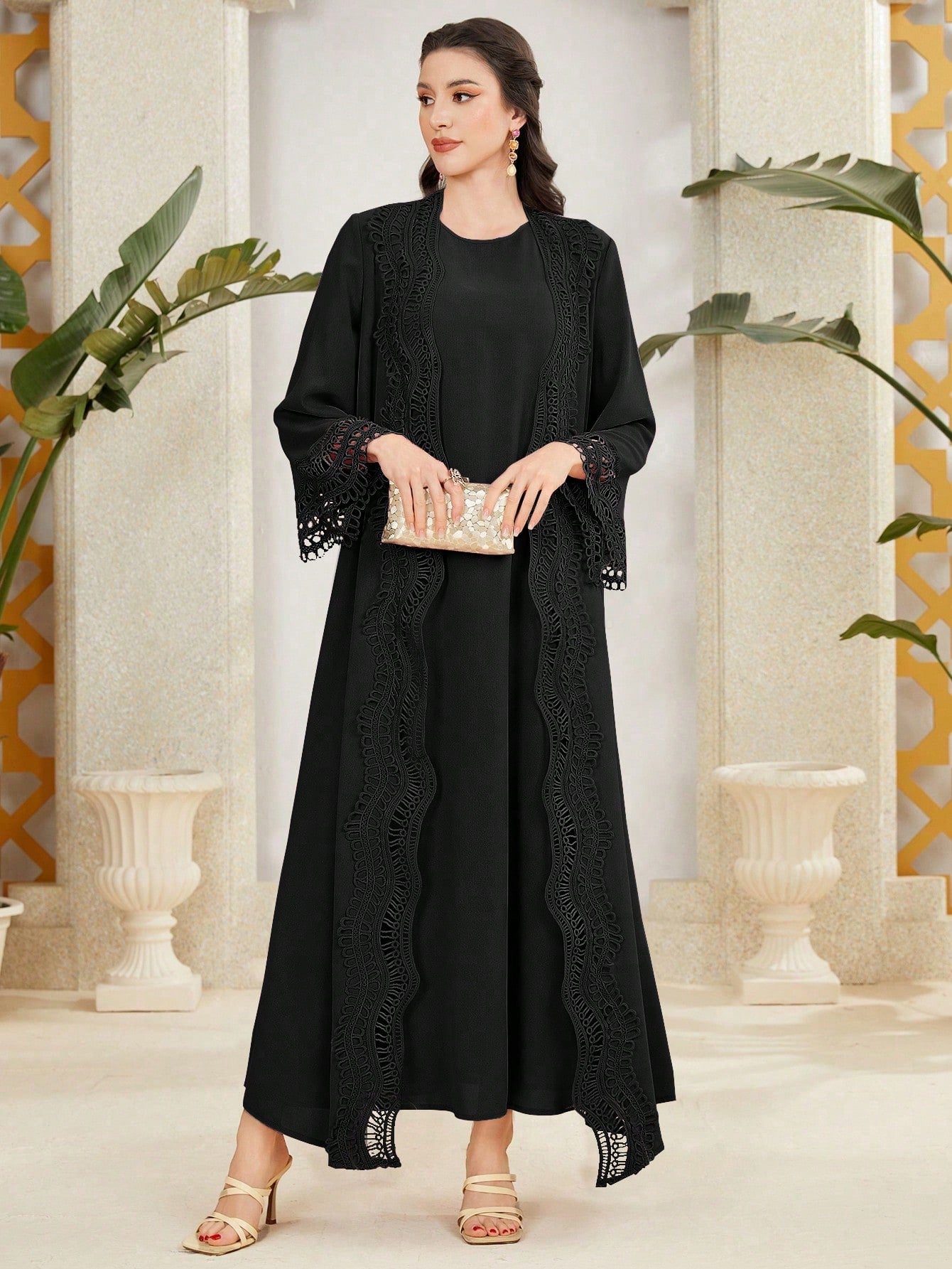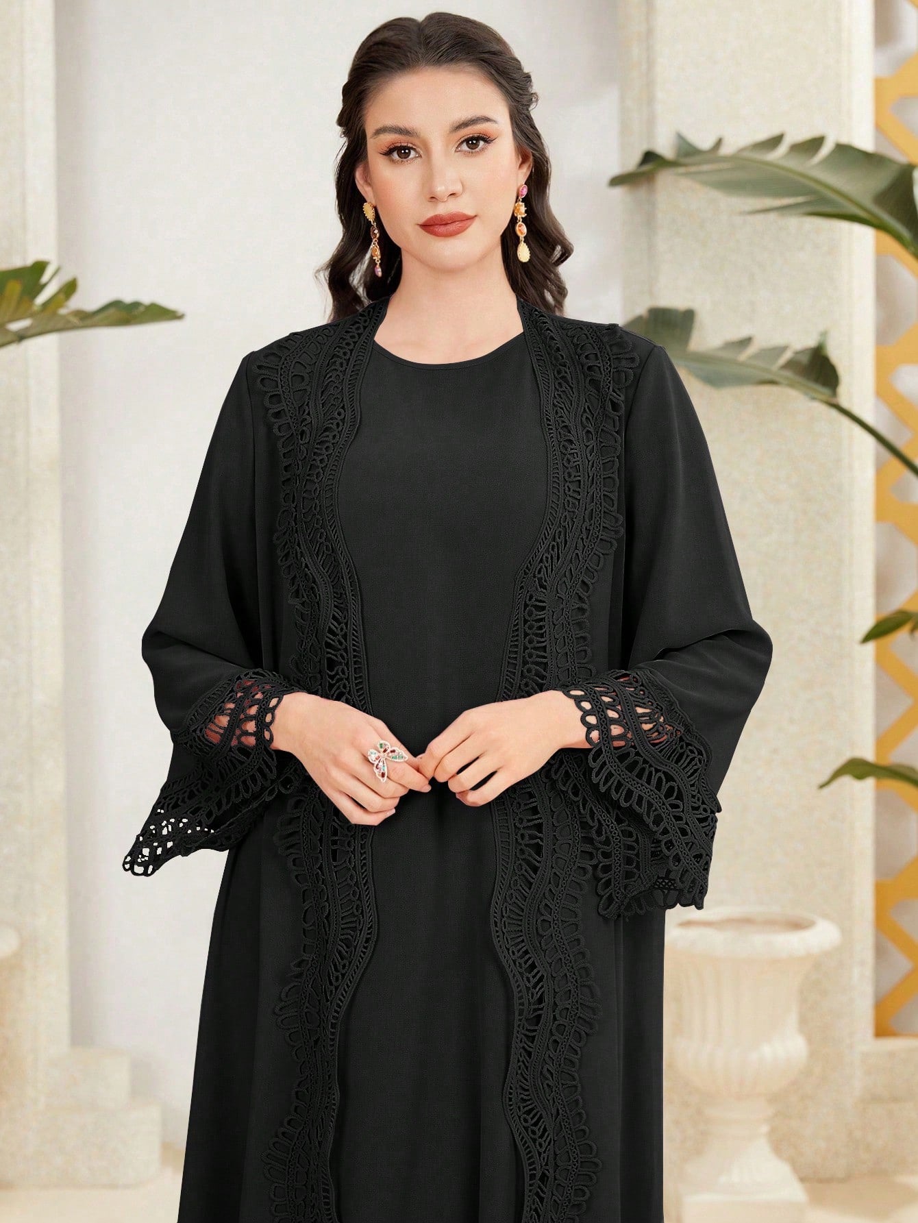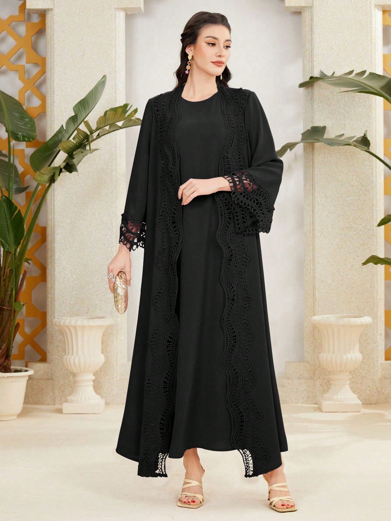 This Shein open black lace cardigan adds a delicate, stylish layer to your outfit. Designed as an outer piece only, it beautifully enhances your look without the inner dress included. Perfect for adding elegance and a touch of sophistication to any ensemble.