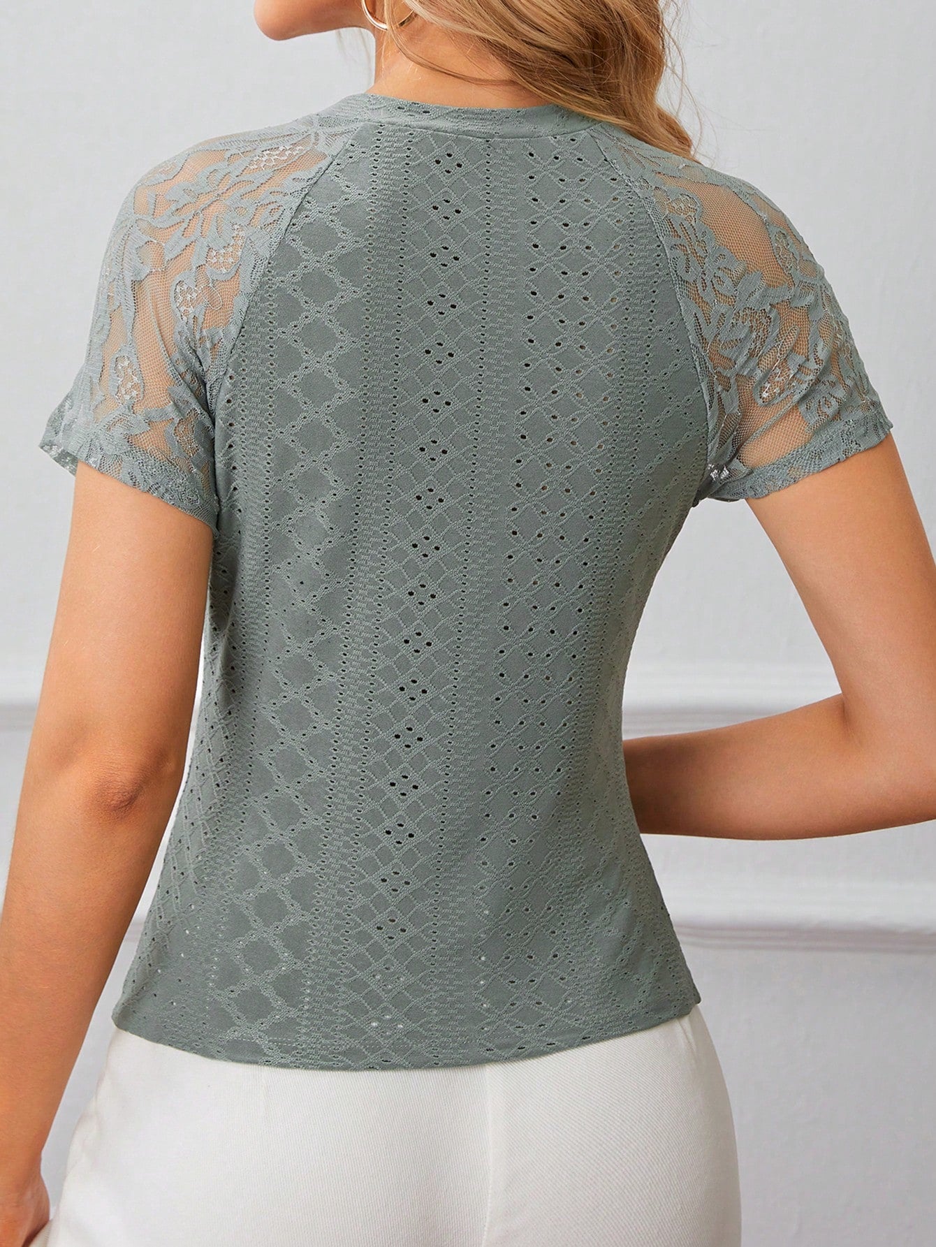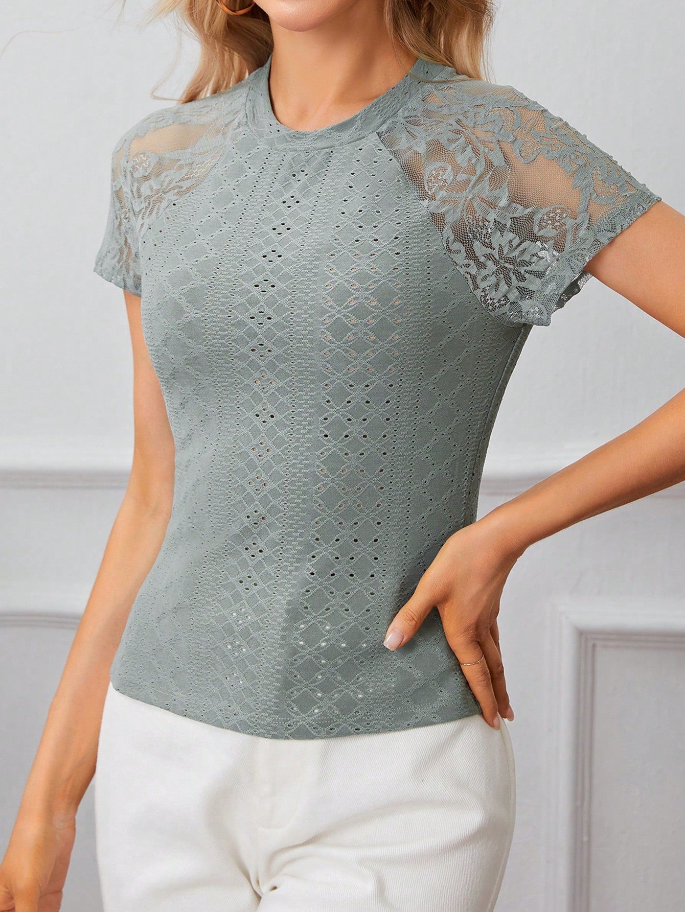 Elegant tee with delicate lace sleeves and soft embroidery details. A feminine piece perfect for both casual days and classy evenings.