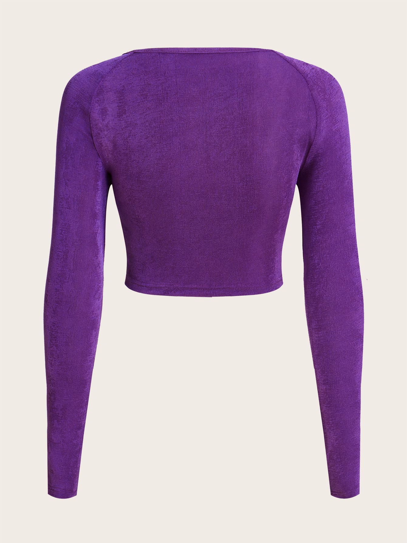 بلوزة كروب توب بنفسجي بتصميم مميز بفتحة أمامية مع حلية مرصعة بالكريستال اللامع 💎. خامة قطيفة أنيقة بلمعة ناعمة، مثالية للسهرات والمناسبات مع بنطلون هاي ويست أو تنورة قصيرة لإطلالة جريئة وعصرية ✨.