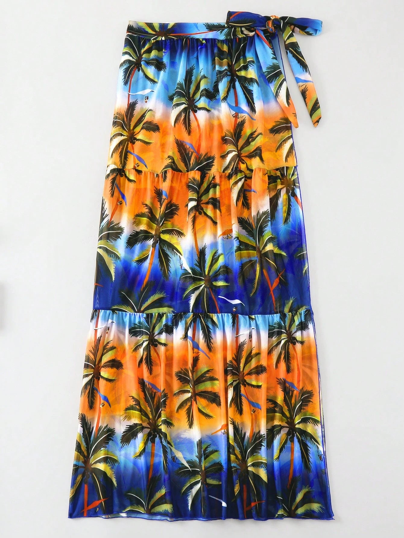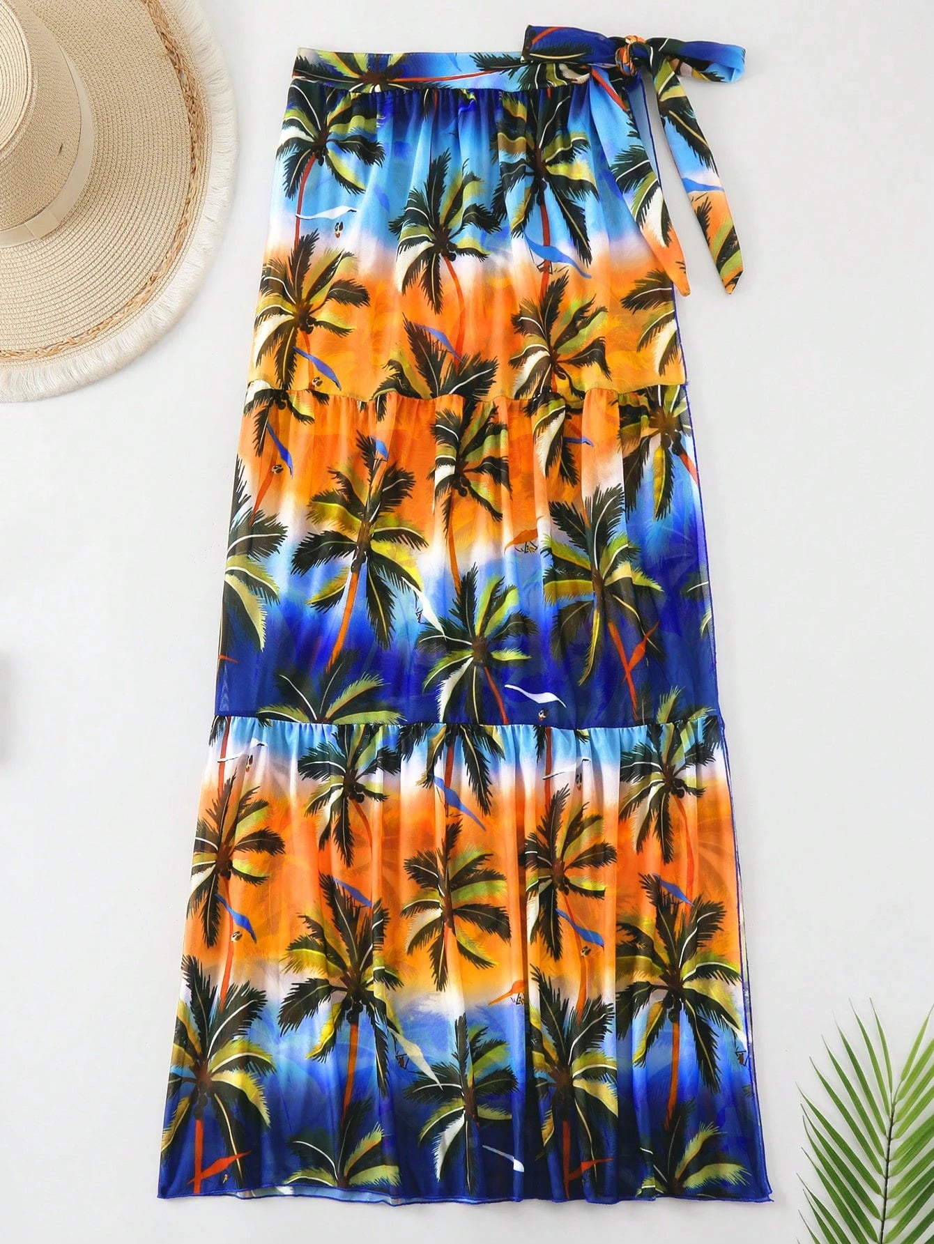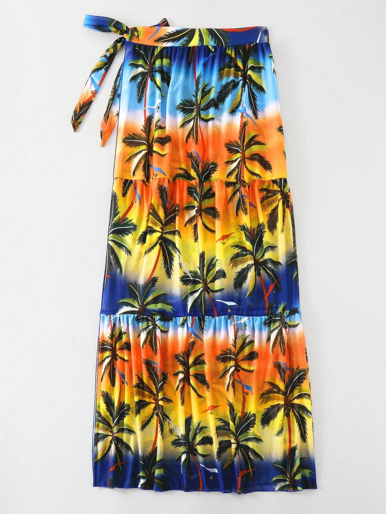 Trendy beach sarong skirt featuring a vibrant palm tree print with ombre shades and a side knot for adjustable fit. Made from lightweight chiffon fabric, perfect for a cheerful summer look at the beach or poolside.