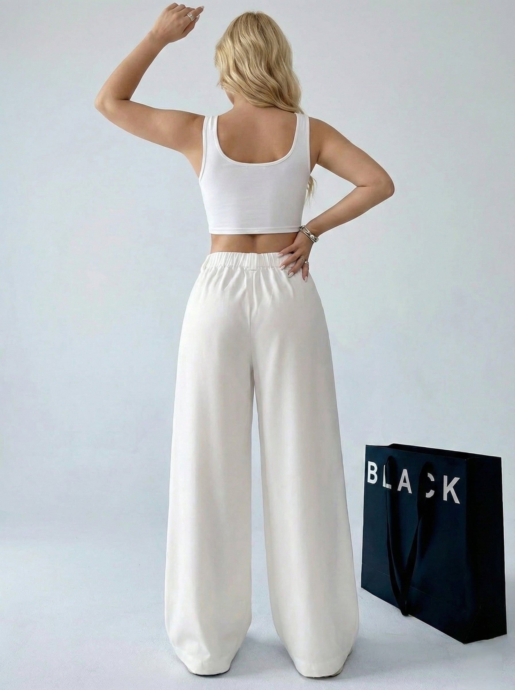 A smooth, elegant wide-leg trouser with a relaxed drape, perfect for everyday comfort and a polished look. The fabric is soft and structured, giving a clean silhouette without clinging to the body. High-waist cut provides a flattering fit.