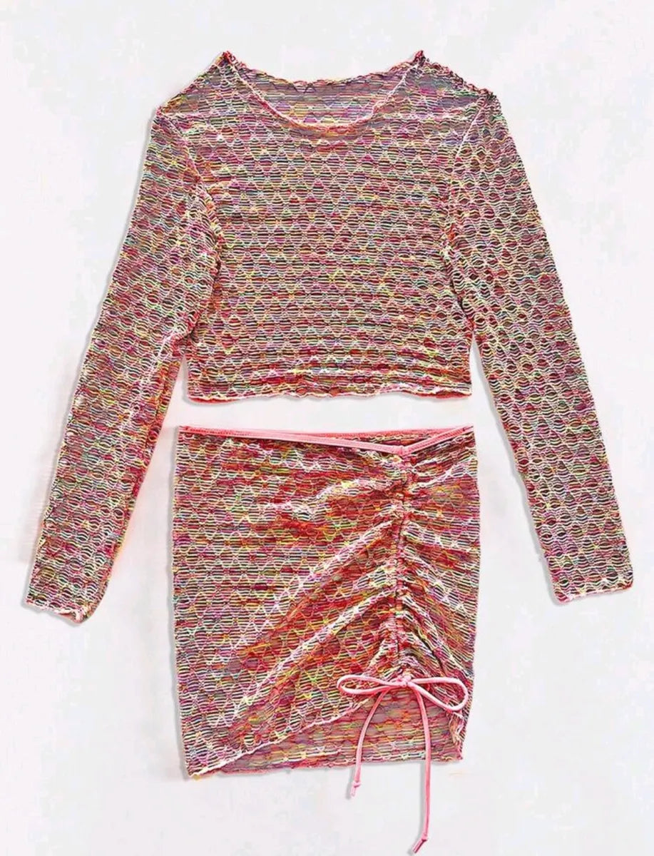 Trendy 2-piece beach cover-up set featuring a long-sleeve crop top and side drawstring mini skirt in soft space dye mesh. Perfect to wear over swimwear for a vibrant and youthful beach look.