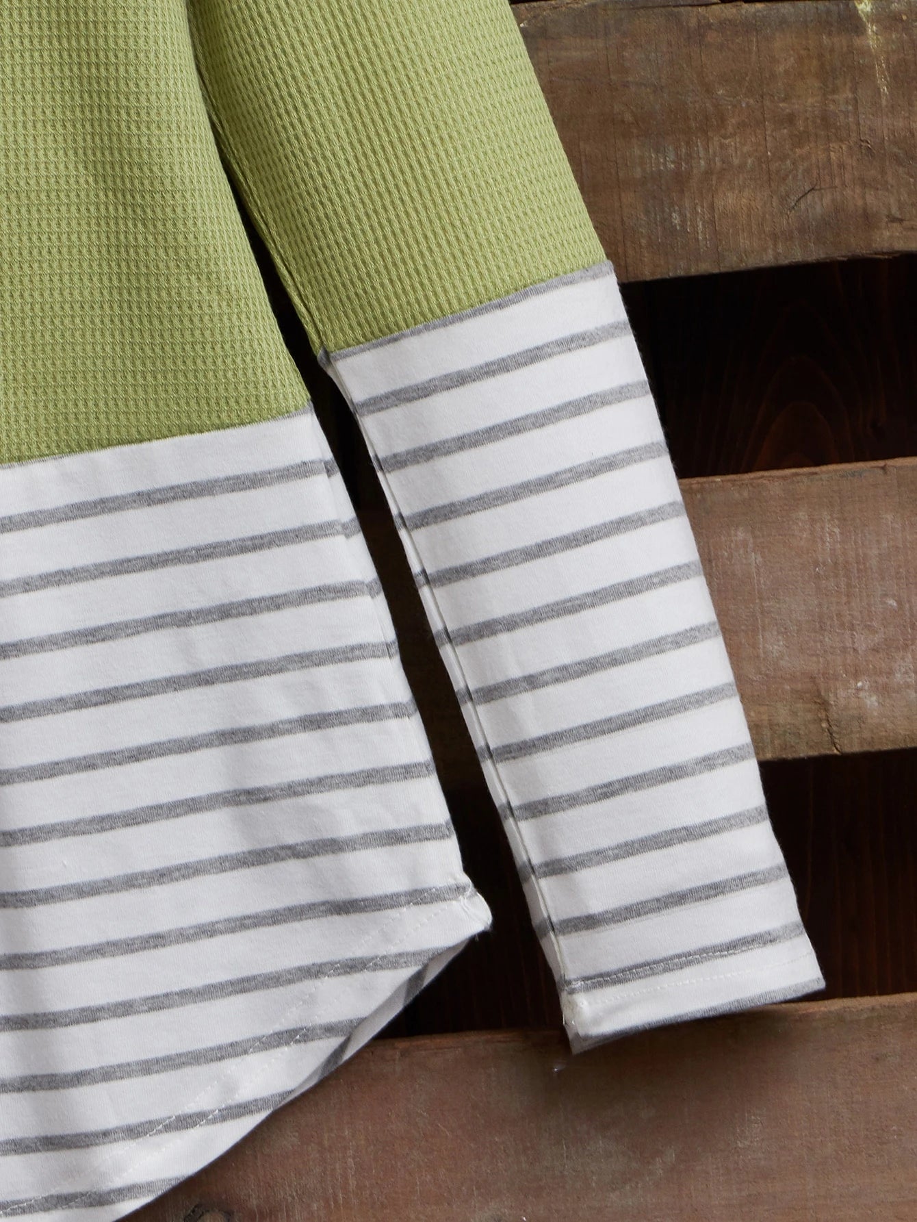 A cozy green and striped sweatshirt featuring a cowl neck with drawstrings and a curved hem. Made from soft waffle-textured knit fabric for warmth and comfort, it’s perfect for casual everyday wear or relaxed autumn outings.